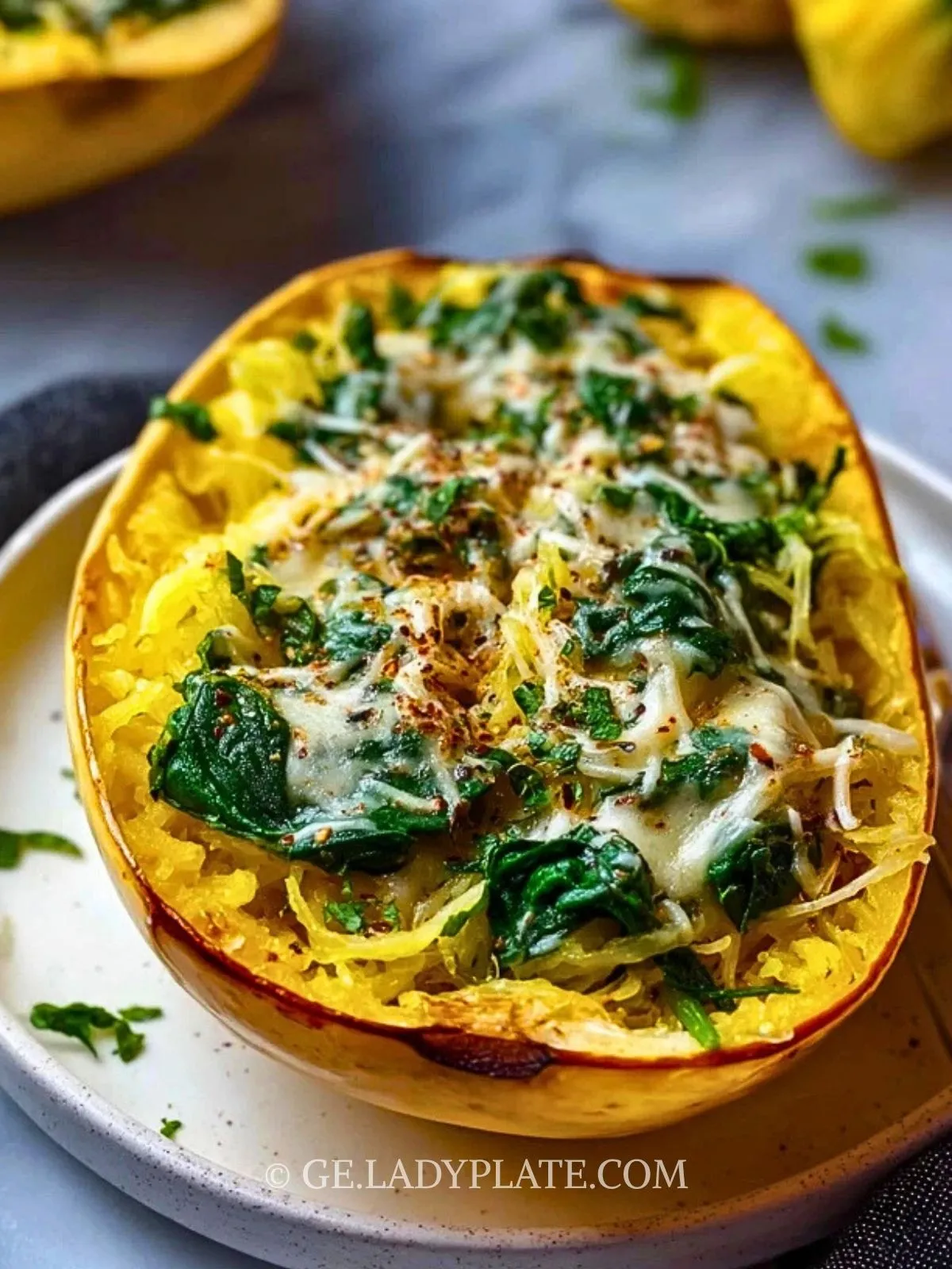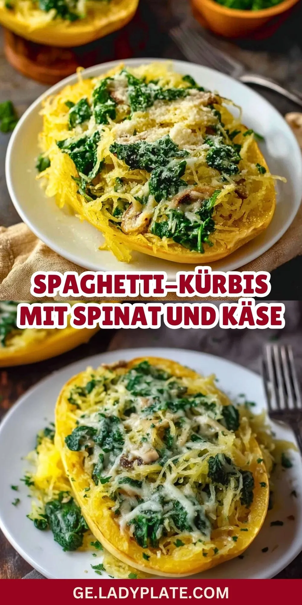 Spaghetti-Kürbis mit Spinat und Käse ist ein cremiges, vegetarisches Ofengericht, bei dem der gebackene Kürbis die Nudeln ersetzt und mit einer würzigen Spinat-Käse-Sauce direkt in der Schale serviert wird.