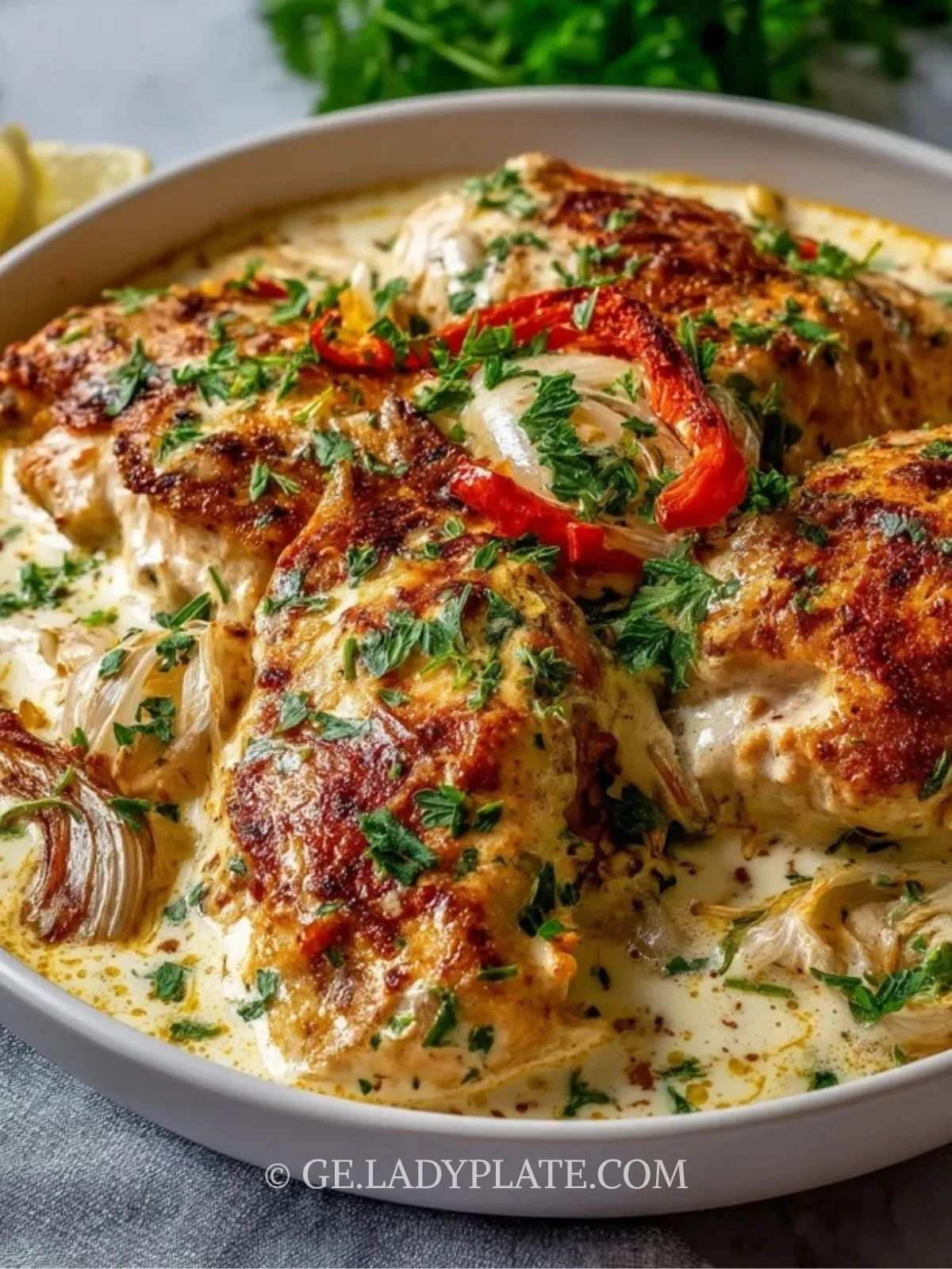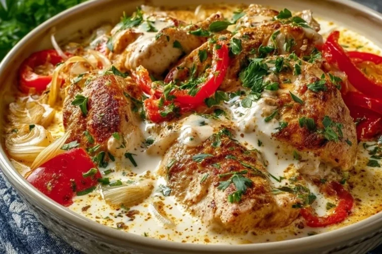 Saftiges Hähnchenfilet, eingebettet in eine samtig-cremige weiße Sauce mit Paprika, Zwiebeln und feinen türkischen Gewürzen – einfach im Ofen gegart, voll orientalischer Aromen und ideal für Familienessen oder Gäste.