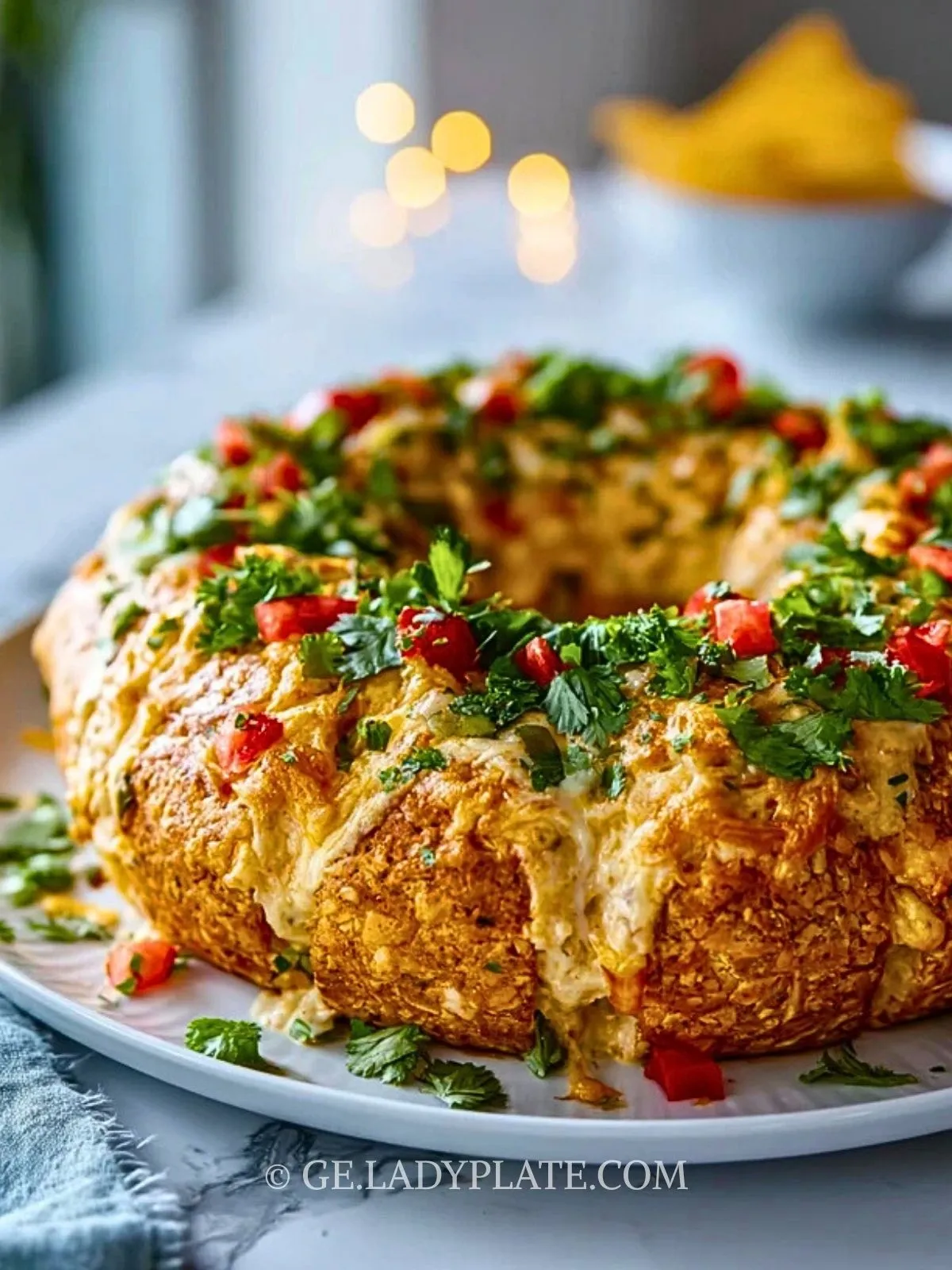 Das Beste: Dieser Taco-Käseball-Kranz lässt sich bestens vorbereiten und im Kühlschrank aufbewahren. Kurz vor dem Servieren wird er mit frischen Kräutern, Granatapfelkernen und Tomatenwürfeln garniert. So kommt Farbe und Frische auf den Tisch – perfekt für gesellige Abende!