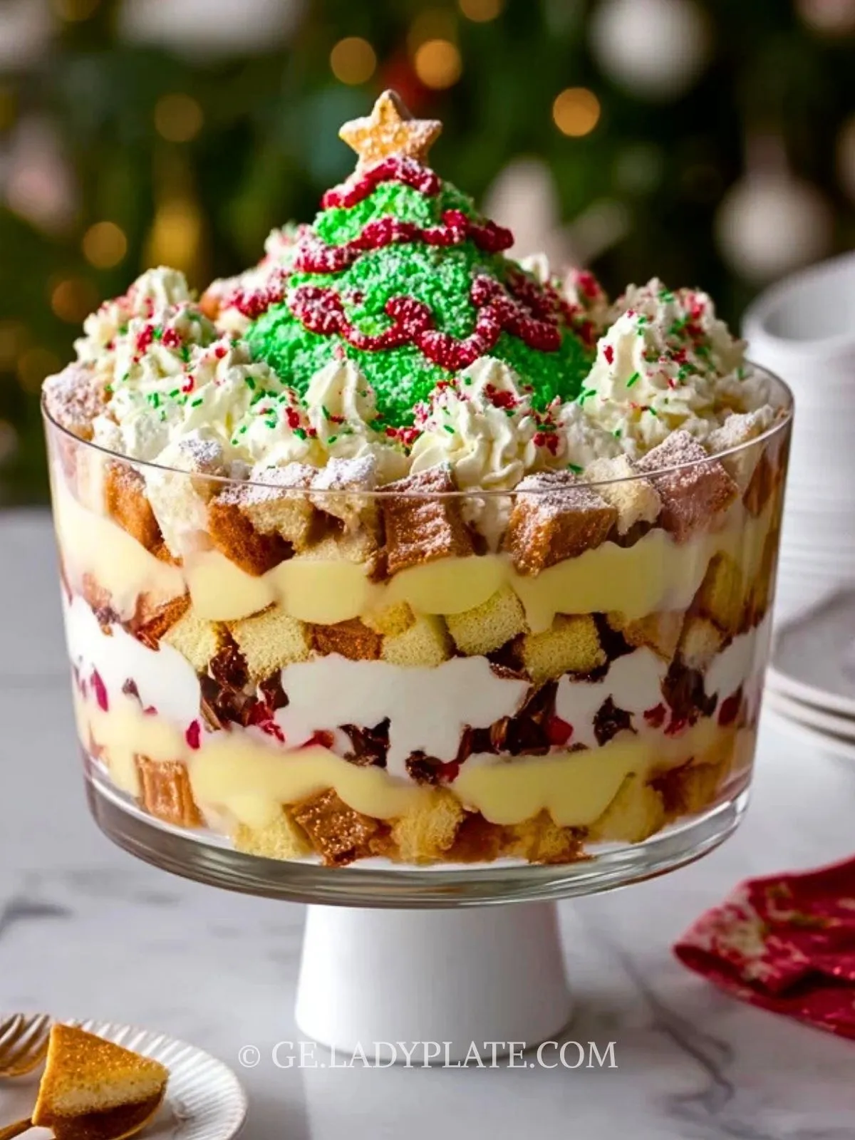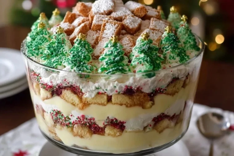 Besonders schön: Die Oberfläche wird mit kleinen Sahne-Tannenbäumen, Zuckerstreuseln und Biskuitwürfeln dekoriert – so sieht dein Dessert aus wie eine verschneite Winterlandschaft und wird zum essbaren Mittelpunkt auf dem Weihnachtsbuffet.
