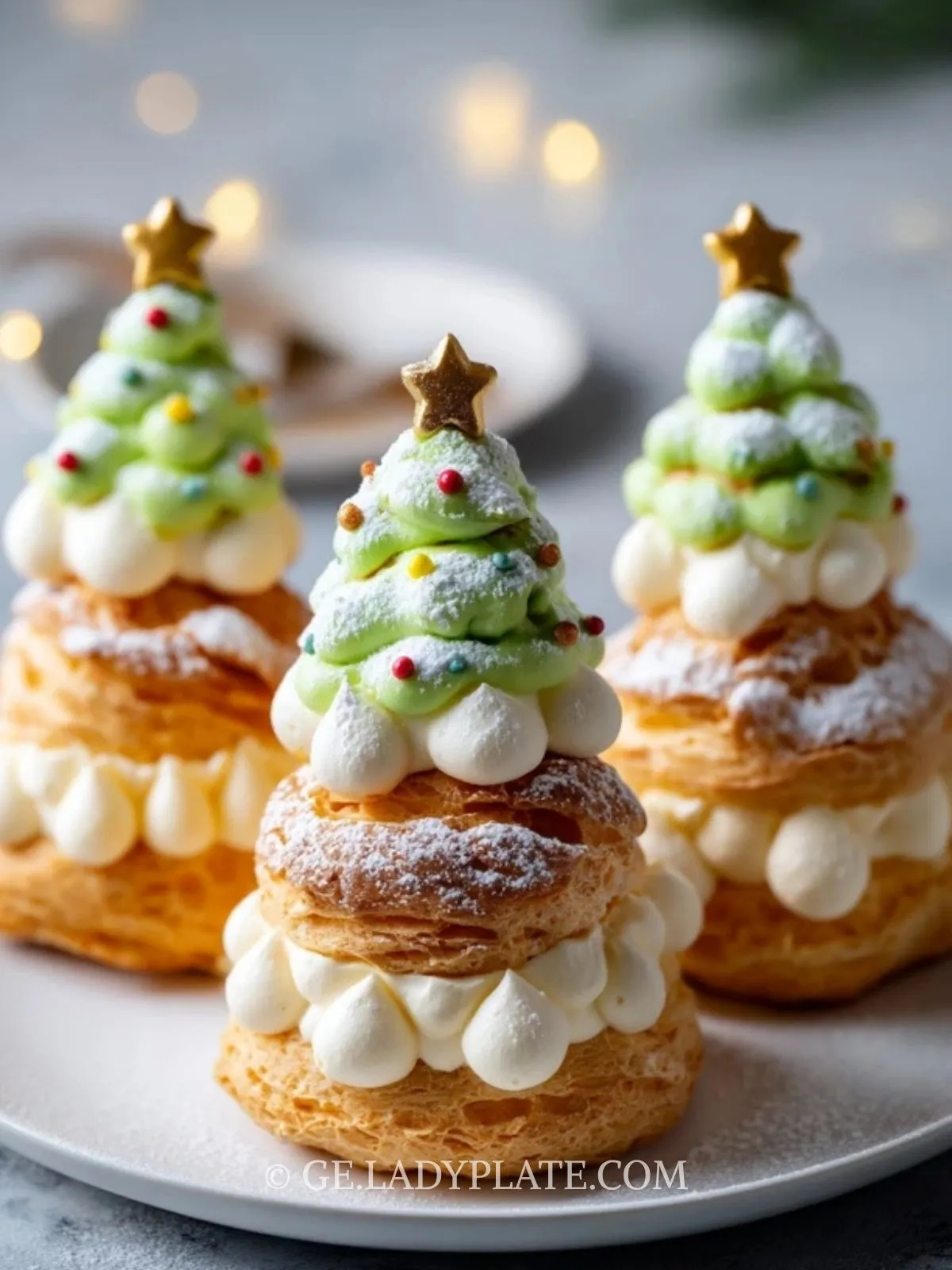 Setze zwischen die Cremeschichten kleine grüne Tupfen. Oben kann ein kleiner Stern aus Gebäck oder Dekoration platziert werden. Zum Schluss alles großzügig mit Puderzucker bestäuben, damit die Windbeutel wie frisch verschneit aussehen.