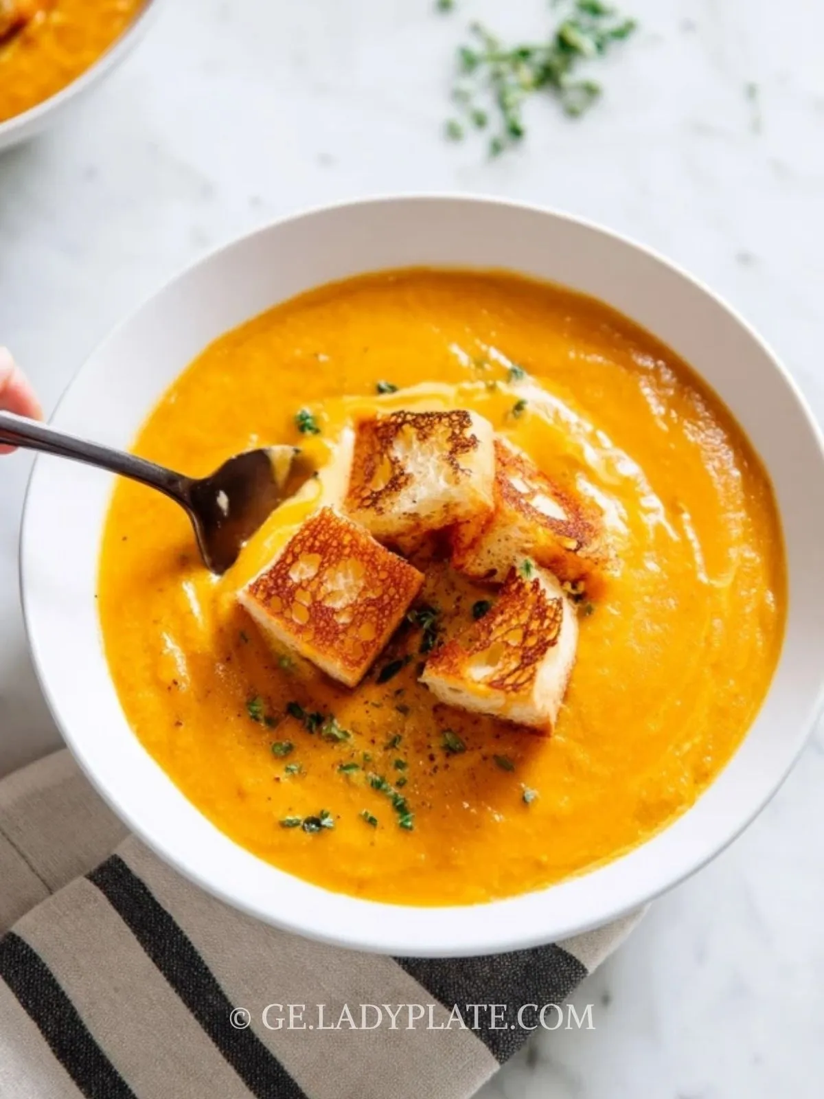 Das eigentliche Highlight sitzt jedoch obenauf: goldbraun gegrillte Käsecroutons, die in der Suppe leicht einsinken, aber außen knusprig bleiben. Sie machen aus einer einfachen Suppe eine kleine Mahlzeit, die satt macht und trotzdem leicht wirkt – perfekt für herbstliche Abende, Gäste oder ein besonderes Wochenende.